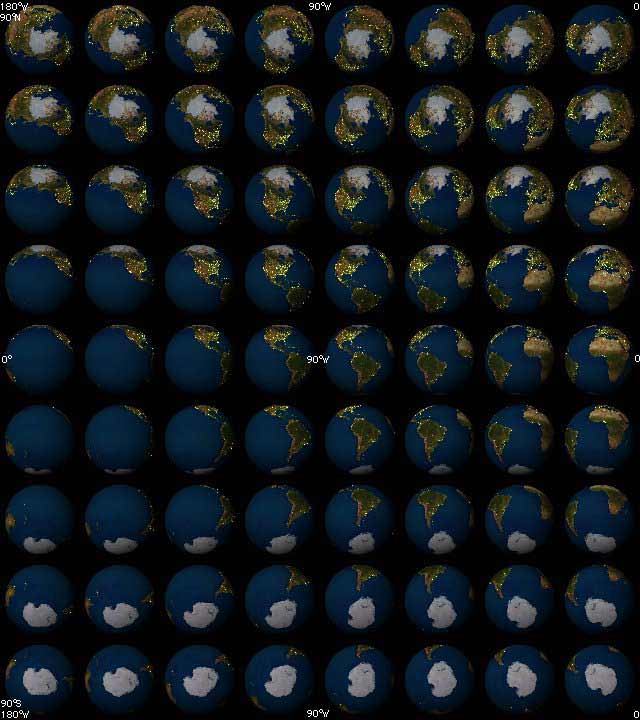 The thumbnails are arranged by longitude, left to right from 180 degrees West to 0 degrees, in increments of 22.5 degrees rotation. Latitude is arranged top to bottom from 90 degrees North to 90 degrees South, in increments of 22.5 degrees. Click here to view from 0 degrees longitude to 180 degrees East or scroll down this page. View sample image.
