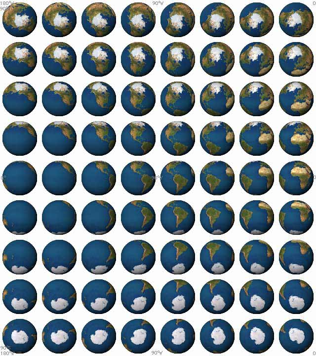 The thumbnails are arranged by longitude, left to right from 180 degrees West to 0 degrees, in increments of 22.5 degrees rotation. Latitude is arranged top to bottom from 90 degrees North to 90 degrees South, in increments of 22.5 degrees. Click here to view from 0 degrees longitude to 180 degrees East or scroll down this page. View sample image.