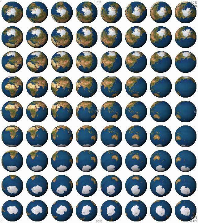 The thumbnails below are arranged by longitude, left to right from 0 degrees to 180 degrees East, in increments of 22.5 degrees rotation. Latitude is arranged top to bottom from 90 degrees North to 90 degrees South, in increments of 22.5 degrees. Click here to return to 180 degrees West longitude to 0 degrees view or scroll back up this page. View sample image.